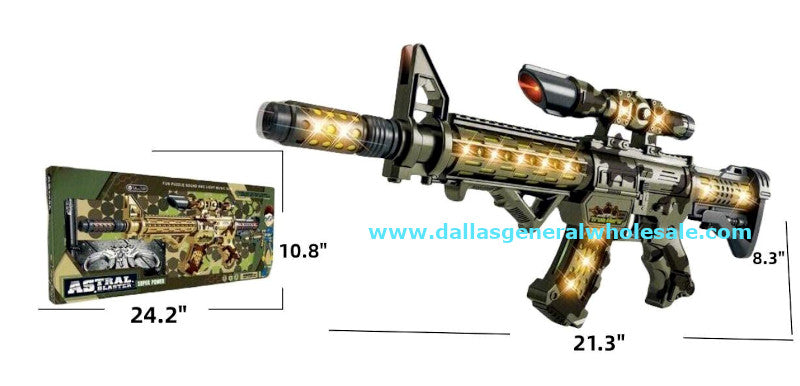 Cheap bulk wholesale little kids battery operated flashing LED light up; vibrating and RX firing sounds toy machine guns. These toy machine guns are featured with bright LED lights in assorted colors; each time the trigger is pulled; the barrel vibrates in and out; super fun toy! Realistic RX combat gun firing sounds as well. Stock up on these toy machine guns toy!