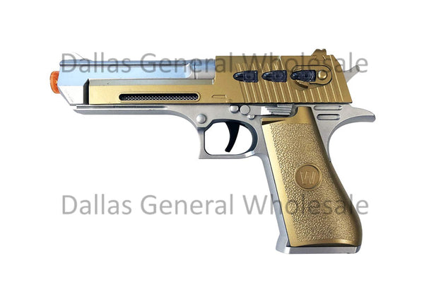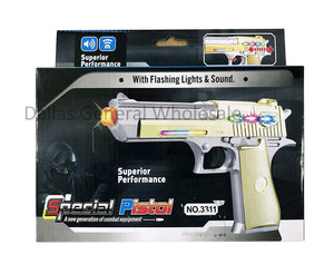 LoginCheap bulk wholesale of battery operated toy special pistol guns for little kids. These toy revolver guns are pretend toys for little boys. 3 pieces of AA batteries are required for the toy hand gun to work. Once batteries are installed, just pull the trigger, and the pistol gun will play in assorted flashing lights and combat sounds. These toy hand guns are bag display. The scope on top of these guns and the red tip make these toy guns distinguishable from real guns.