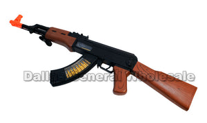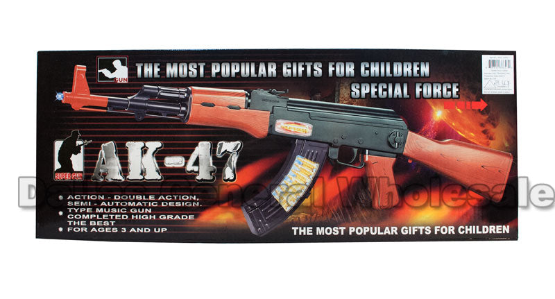 LoginCheap bulk wholesale of little kids battery operated machine guns. These AK-47 toy machine guns features a semi-automatic design, LED lights, and sound. Every time the trigger on the toy AK-47 is pulled, a realistic firing sound is heard from the machine gun. The wood-like handle and barrel of the gun gives the toy gun a realistic look. Really Cool and Fun. Suitable as gifts for little boys. Stock up on these toy AK-47 machine gun today!