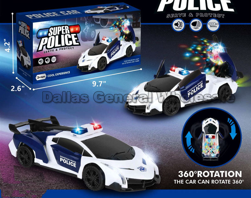 LoginCheap bulk wholesale of children's battery operated toy police race cars. These children's toy police cars are cool race car design; featured with flashing light up car bodies; light colors include red, blue and green; flashing simultaneously; these toy police cars also plays music and siren sounds once turned on. These toy battery operated cars open up and closes its doors automatically.