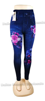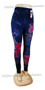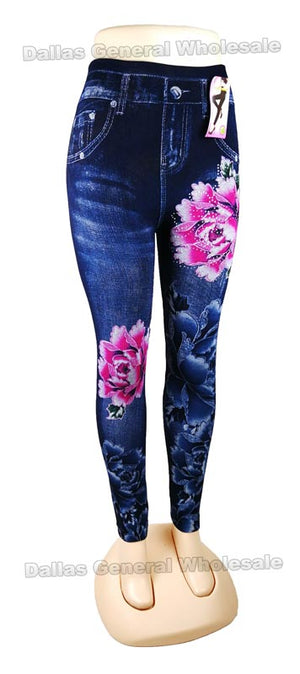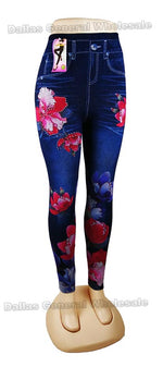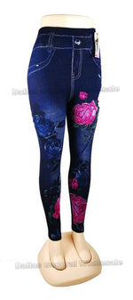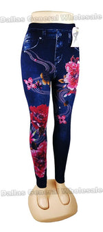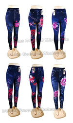 Cheap bulk wholesale of ladies printed pull on jean like leggings; also known as jeggings. These women's fashion printed jeggings are super stretchy and designed for a perfect fit. These ladies pull on roses designed jeggings are perfect for Spring, Summer and Early Winter weathers.