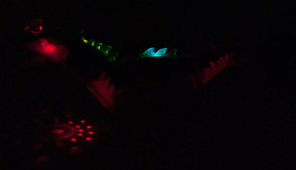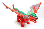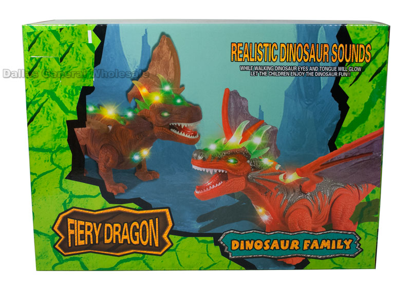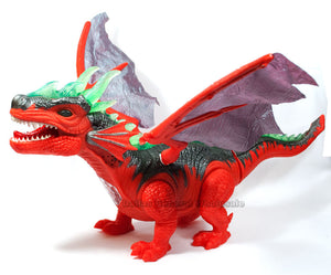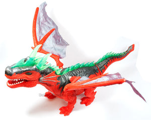Cheap bulk wholesale of children's battery operated walking realistic fiery dragon figure toy. This fiery dragon toy features with flashing lights and realistic dragon roaring sounds. These battery operated toy dragons flaps its wings and the entire body flashes in different LED lights while roaming around; bump and go features.