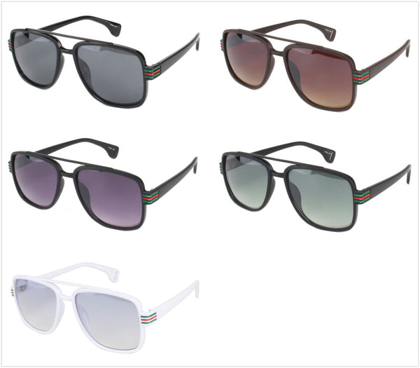 Discover a wholesale eyewear staple that bridges retro-aviator heritage with modern luxury-inspired detailing — these square aviator sunglasses feature a classic double bridge construction paired with a signature red-and-green stripe accent at the temple, a designer-coded detail that drives immediate brand recognition among fashion-conscious shoppers. The bold, structured square profile sits confidently across all face shapes while gradient lenses in five versatile colorways ensure broad retail appeal from neutral staples to trending statement shades.