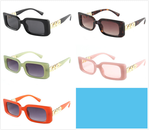 Product Type: Women's Fashion Sunglasses Style: Rectangle Frame with Gold Chain Detail Available Colors: Tortoise/Brown, Black/Smoke, Sage Green/Lavender, Orange/Mauve, Pink/Clear