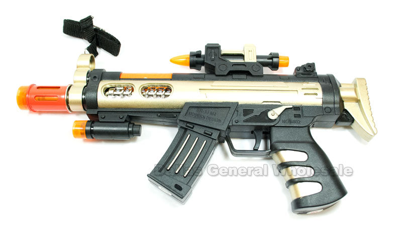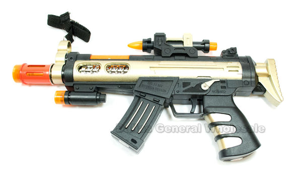 LoginCheap bulk wholesale of children's battery operated toy machine gun; with flashing LED lights, gunfire sounds and vibrates when trigger is pulled. These children's toy machine guns is also featured with detachable and adjustable shoulder straps.