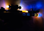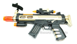 Realistic toy battery operated hand held machine gun; very cool shotgun with FX fire sounds and flashing lights. Machine gun sounds and vibrates; and barrel extends in and out each time trigger is pulled, and the bullets rotates each time trigger is pulled.