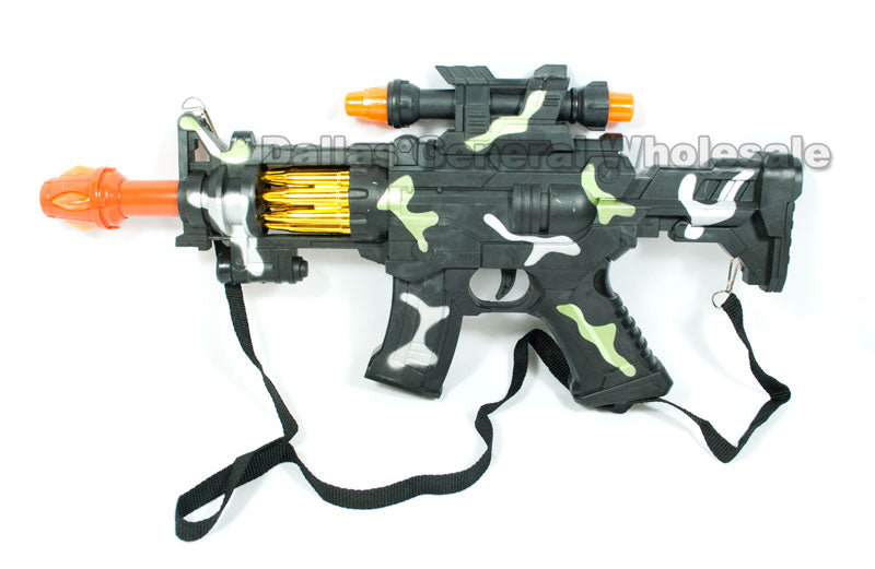 Cheap bulk wholesale of children's battery operated toy camouflage machine gun; with flashing lights, machine gun firing sounds, rotating bullets and vibrating effects when trigger is pulled. These children's toy machine gun is also featured with detachable and adjustable shoulder straps.