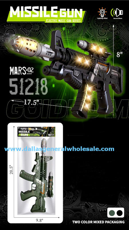 LoginCheap bulk wholesale of children's battery operated toy machine guns; with lights, sounds and vibrates when trigger is pulled. These little boys toy machine gun is also featured with detachable shoulder straps. Realistic toy battery operated rifle gun; very cool shotgun with FX fire sounds and flashing lights. Machine gun sounds and vibrates; and barrel extends in and out each time trigger is pulled. Swing out stand and shoulder strap is included. Requires 3 AA batteries. (included)
