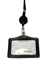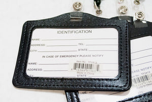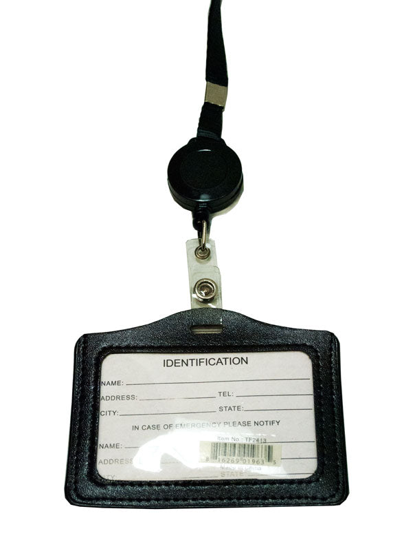 ID or Badge holder with lanyard. Horizontal style for your ID or Badge. Faux leather, lanyard is adjustable for costume fit but it is not removable.
