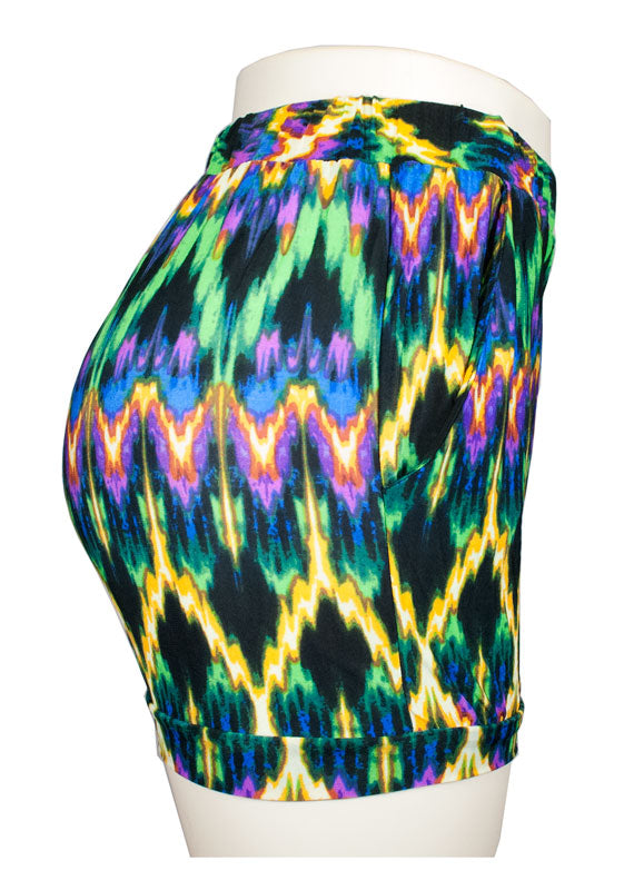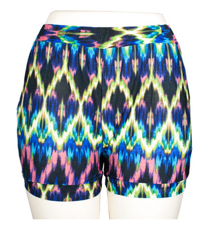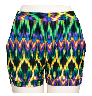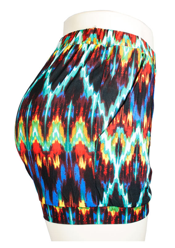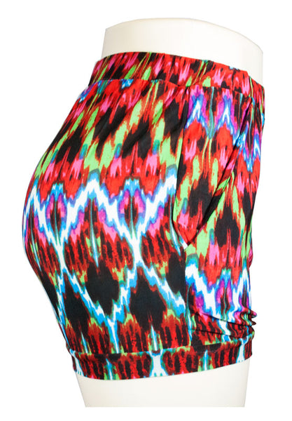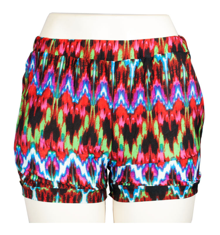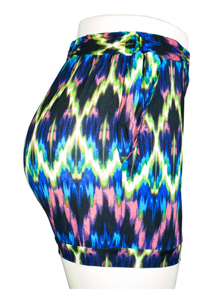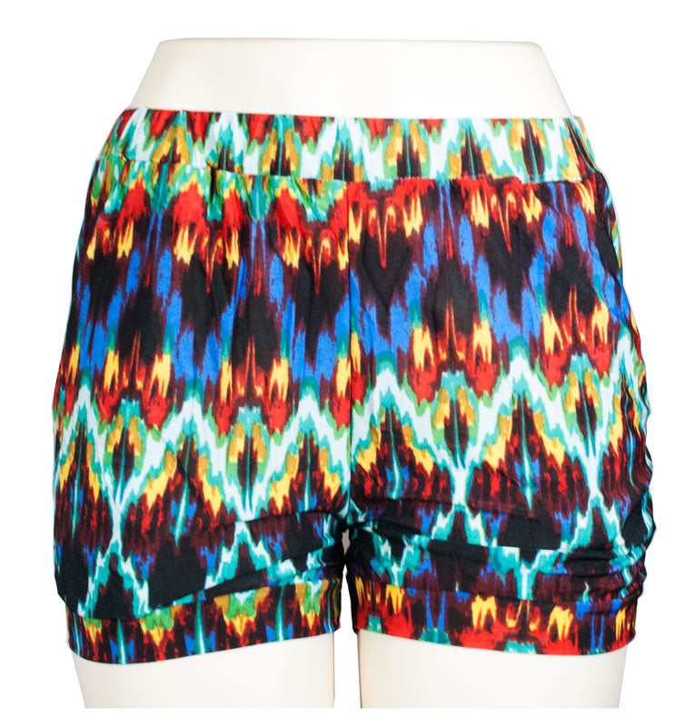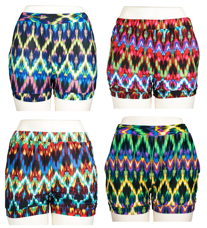 Cheap bulk wholesale of ladies summer fashion apparel; comfy casual pull on style shorts in different colors and prints. These girls shorts are silky feel; super comfortable to wear in the hot summer days, with added fashion style of assorted tie-dye like prints. These shorts are featured with elastic waist line; making these shorts fit most body types. These women's pull on casual shorts are also featured with 2 front pockets for convenience.