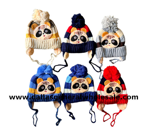 • Wholesale Children's Toddlers Winter thick fleece insulated knitted ear flap toboggan hats with fluffy bear and pom pom balls designs