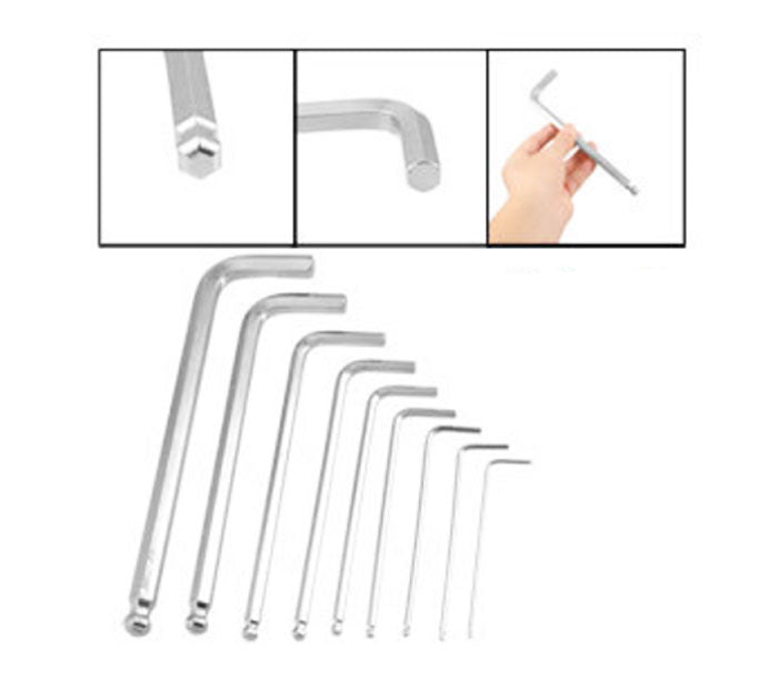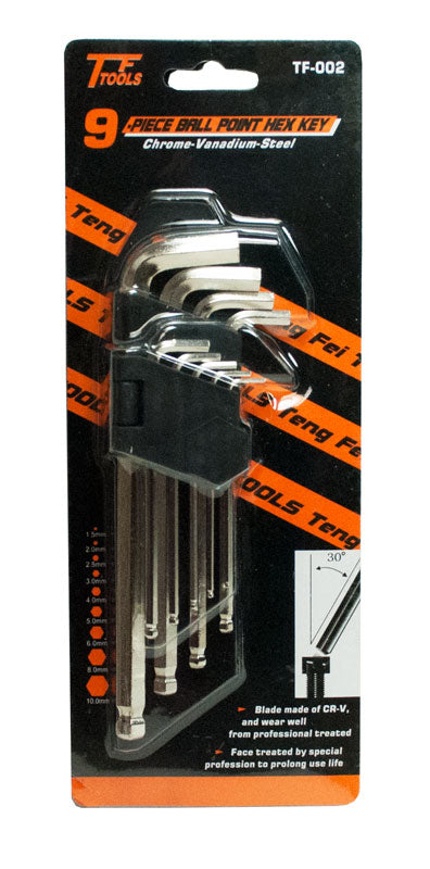 9 PC Ball Point Hex Key Wrench Set designed in "L"shape for easy to grip and convenient to use. These Ball Point Hex keys are made to fit for hex head bolts on the machine, car vehicles etc.
