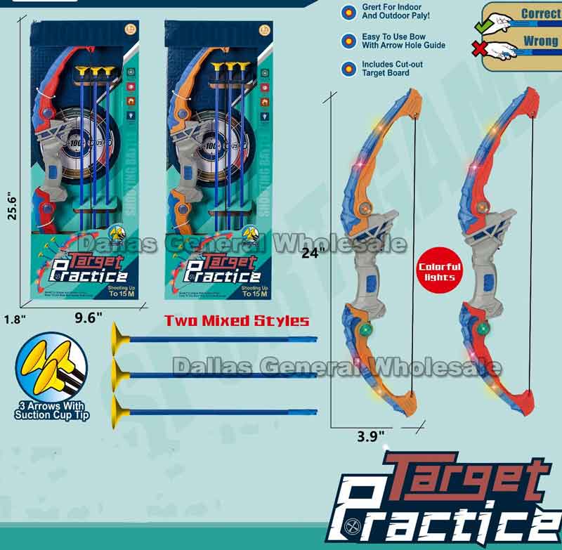 LoginCheap bulk wholesale non battery operated bow and arrow archery play set. These high quality bow and arrow play sets are featured with one human size bow with 3 dart arrows and 1 dart board. The arrows also light up on the handles. These battery operated archery play sets are high in quality with vibrant colors.