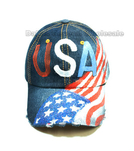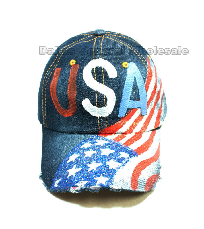 Ladies fashion denim caps in glitter USA flag design. These women's fashion denim caps are painted with beautiful glitter USA flag designs. These ladies casual denim caps are one size fits all. These ladies caps are great caps for Memorial Day and July 4th, independence day. Stock up on these ladies casual caps to represent your American pride today!