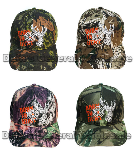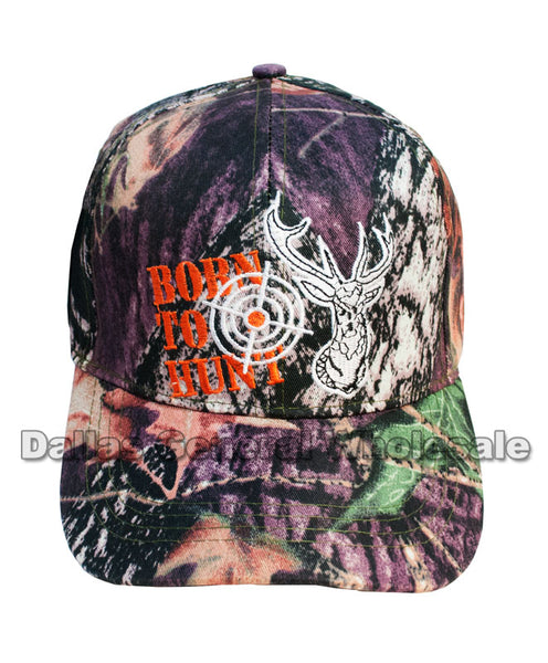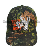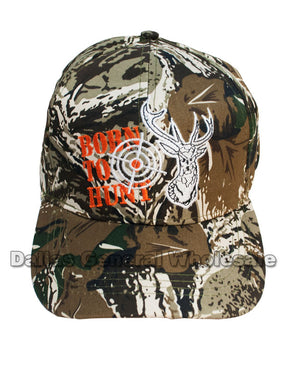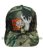 Bulk wholesale of adults casual baseball caps with camouflages prints and stitches of deer head with the prints "BORN TO HUNT" next to it. These casual baseball caps are high quality cotton and quality stitches. These casual caps are suitable for both men and women; they are great hunting caps also! These baseballs caps are feature Velcro straps in the back making this cap one size fits most.