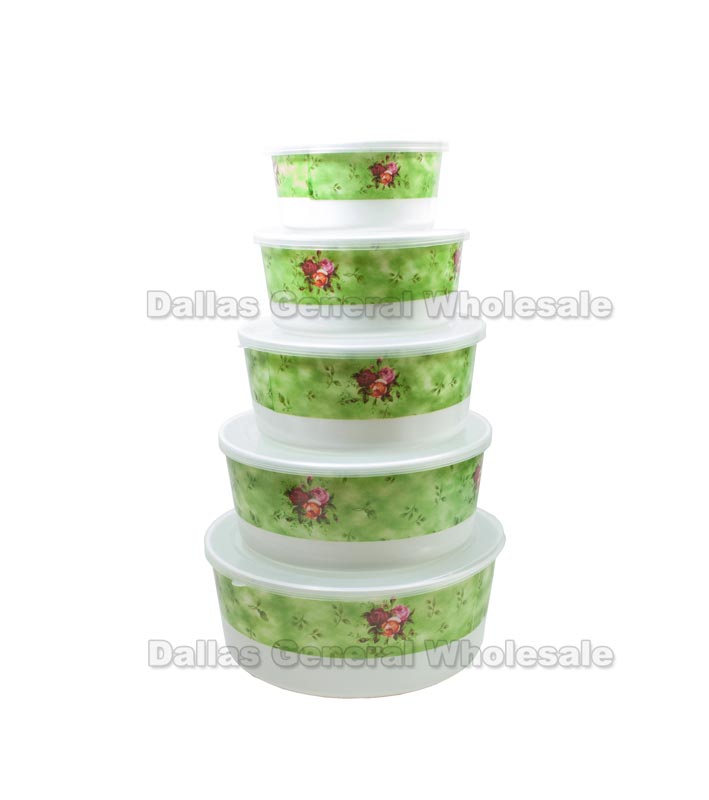 LoginCheap bulk wholesale of 5 pieces food storage bowls with lids. These food storage bowls come with snap on lids for easy food storage. 5 assorted size in the pack; great for any portion food storage purposes. Cute flower print designs. Stock up on these food storage bowls with covers today!