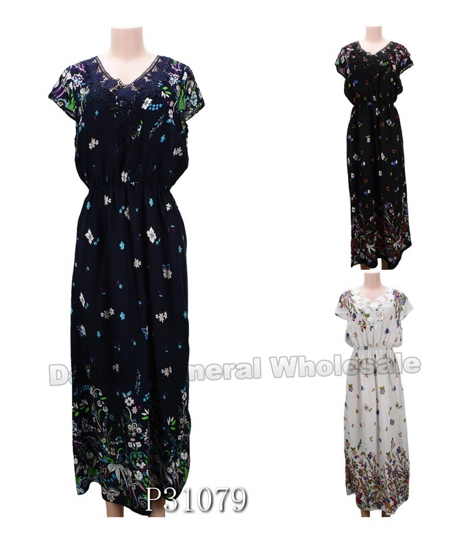 LoginCheap bulk wholesale of women's Summer long sun dresses. These ladies maxi dress is above ankle length for most ladies. These women's fashion sun dresses are featured with 3 beautifully colors and prints. These women's sun dress is designed with beautiful lace around the neck line with a cute sleeve coverage; super cute!