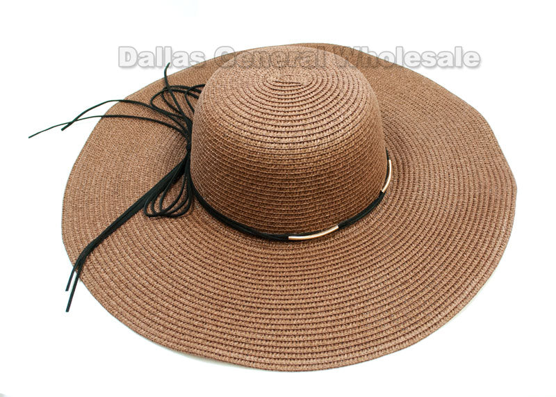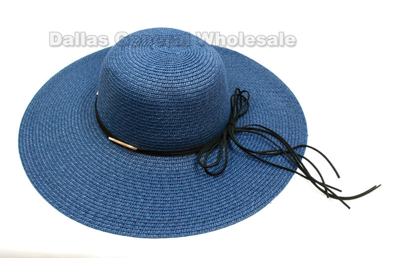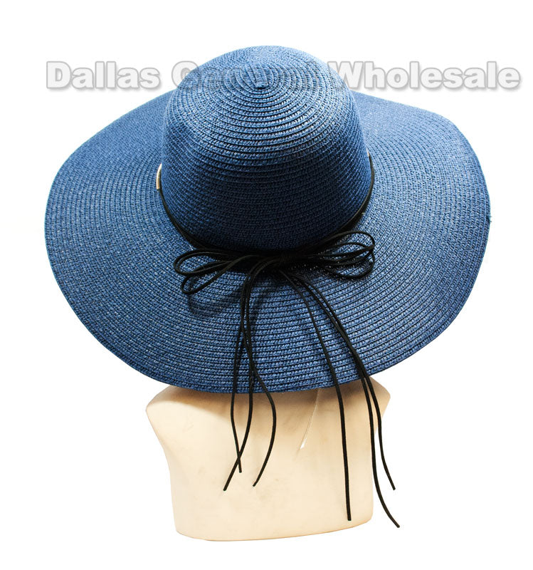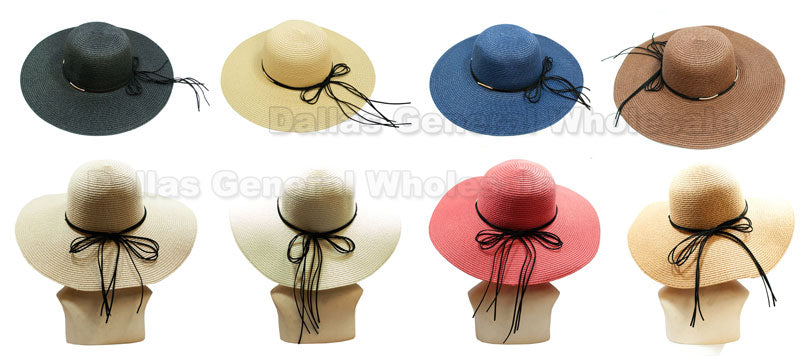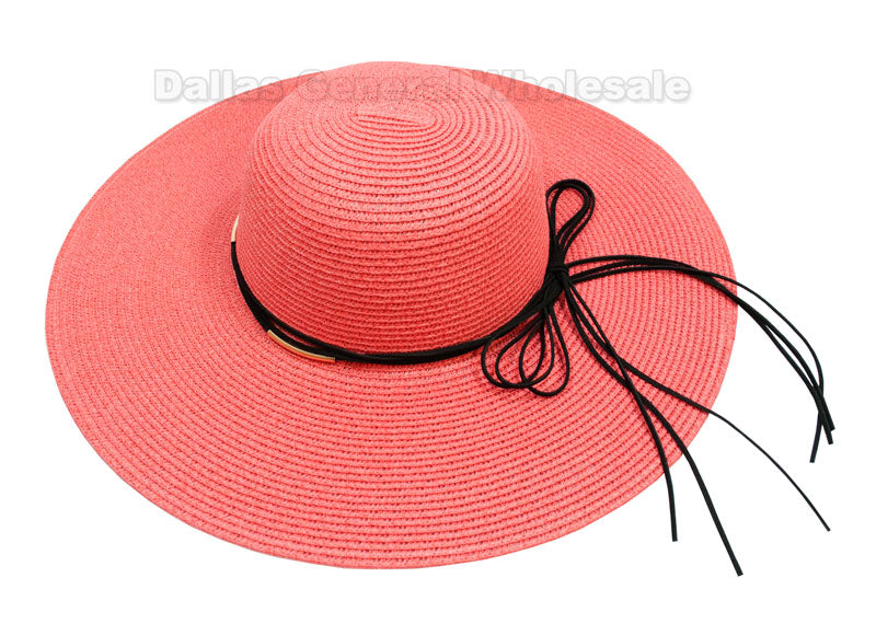 • Ladies Summer Fashion Floppy Solid Color Straw Hats with Faux Leather Hat Bands Wholesale