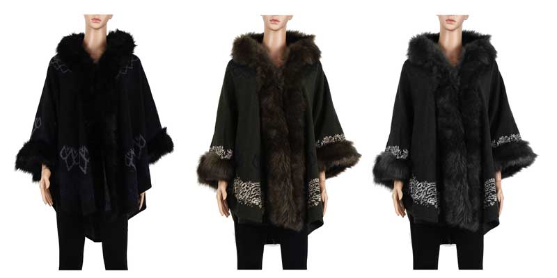 LoginCheap bulk wholesale of women's very cute Fall and Winter Apparel; faux fur cape Poncho or Cardigan with beautiful prints. These ladies cardigan capes are made with high quality cotton, heavy thick material; great for the cold seasons. These fashion Poncho or Cardigan are super cute; with faux fur designs around the sleeves and the neck. These poncho capes are also with fur lining hood.These ladies cardigans or poncho capes are little above knee length for most women. Stock up on these ponchos today!
