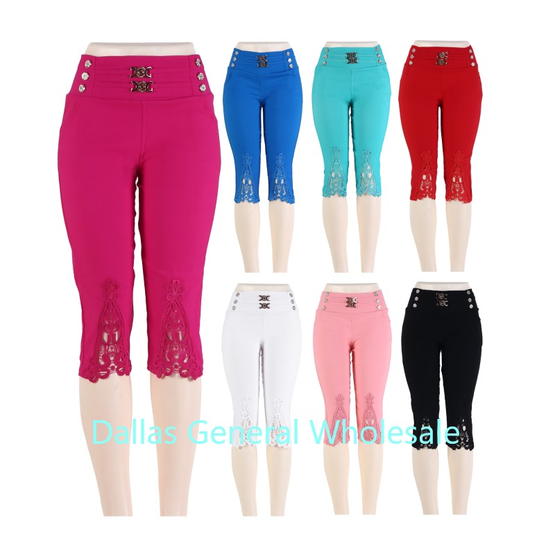 Cheap bulk wholesale of ladies summer fashion apparel; solid color pull on Capris pants. These women's casual Capris are beautifully designed with lace flower at the bottom of each leg; very popular! These ladies or teen's fashion Capris pants with real front and back pockets will go with almost any top; a beautiful look in the summer time. These solid color Capris pants are pulled on, fitted style.