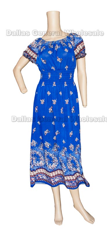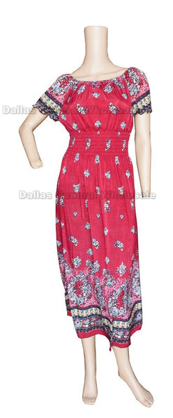 Cheap bulk wholesale of women's Summer long maxi sun dresses with short sleeves that can turn into straight shoulder design. These ladies maxi dress is ankle length for most ladies. These women's fashion sun dresses are featured with 4 beautifully colors and floral prints. These women's Summer fashion dresses are very cute to add to your inventory this year!