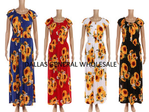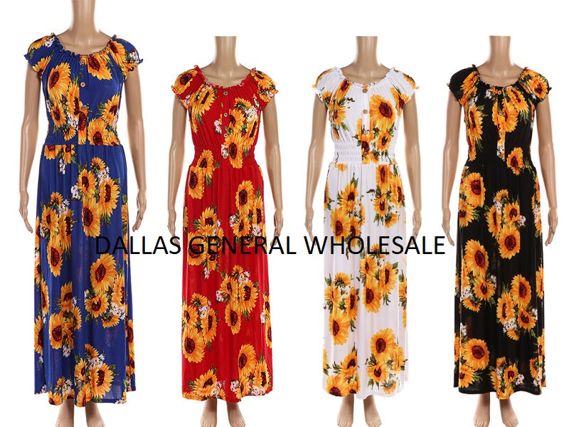 LoginCheap bulk wholesale of ladies Summer fashion floral maxi sunflower long dresses. These straight shoulder sun dresses are featured with elastic top and faux buttons. These summer 1 piece dresses are above ankle length for most women. These missy fashion dresses are silky to touch, light weight to wear, top of the line quality. Assorted sizes in the pack. Stock up on these ladies fashion maxi sun dresses today!