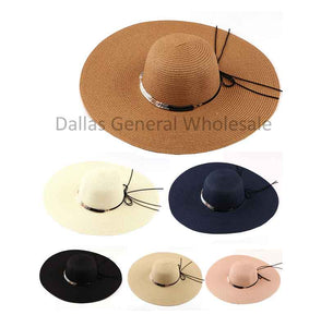 Cheap bulk wholesale of ladies wide brim all around fashion summer floppy beach straw hats! These women's summer fashion floppy straw hats are featured with assorted solid colors. These ladies' beach straw hats are featured with wide brims and a cute faux leather hat band. These ladies floppy straw hats are classy in design, high in quality.