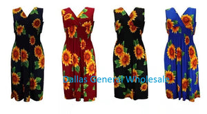 Cheap bulk wholesale of ladies Summer fashion big sun flower printed calf length maxi sun dresses. These sun dresses are featured with sleeves-less design and beautifully printed. These summer 1 piece dresses are calf length for most women. These women fashion dresses are silky to touch, light weight to wear, top of the line quality. Assorted sizes in the pack. Stock up on these ladies fashion maxi sun dresses today!