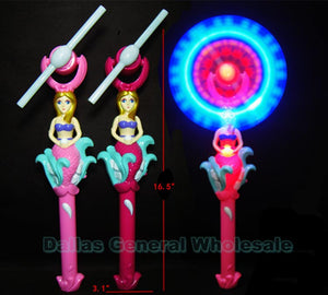 LoginCheap bulk wholesale of assorted colors of flashing light up spinning windmill wands with mermaid princess design. Flashing multi color lights. Color of lights include, red, blue,yellow,green and etc. On/Off Switch Buttons are on the side of the wand handle. Glowing in dark spinning wind mill wand is a great idea for party favors and is a great item to add to your toy store, novelty gift shop, carnival events or any general merchandise store. These flashing wind mills with merimaid are perfect for night time music festivals and carnival events also.