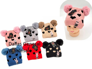 Cheap bulk wholesale of children's warm Winter head gears. These kids Winter adorable fur insulated knitted toboggan beanie hats with 2 pom pom balls designs are super warm and cute to wear. These little kids' winter adorable toboggan beanies are featured with thick faux fur inside for added warmth.