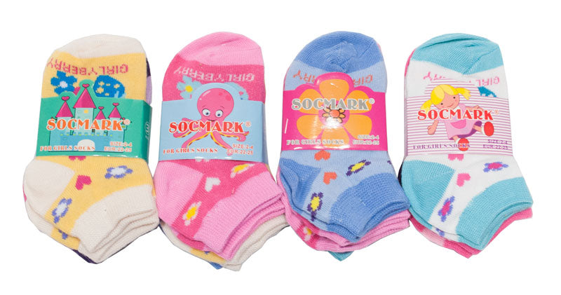 LoginBulk wholesale of Little Girl's ankle cotton socks in adorable little heart and pretty strawberry prints. These kids cotton socks are perfect selection for every day wear for the little girls, also may be ideal for school uniforms. These little girls cotton ankle socks are comfortable fit with assorted colors.
