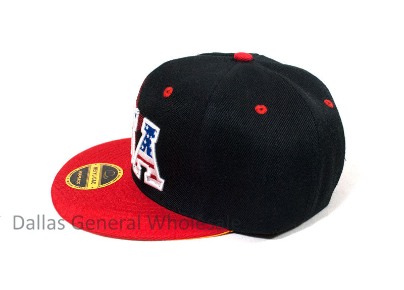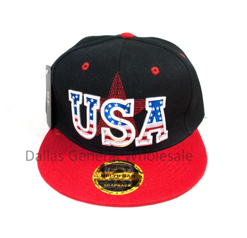 Cheap bulk wholesale of young men's fashion casual "America USA Flag" snap back flat bill caps. These fashion snap back flat bill caps are very competitively priced and a must have trendy cap to add to your dollar store, general merchandise store, novelty stores, hats and caps shops or flea market vendors.