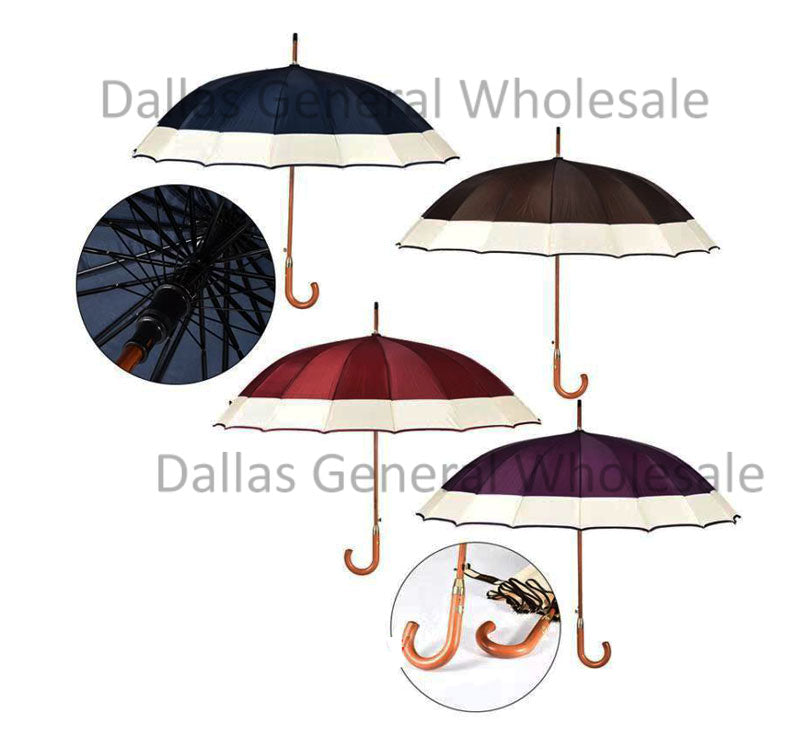Cheap bulk wholesale automatic large size umbrellas with real wood handle. These jumbo parasols are made with 16 durable metal ribs. Large tinted interiros great for both raining and sunny days. These adutls jumbo umbrellas are designed with ergonomic and solf handles.