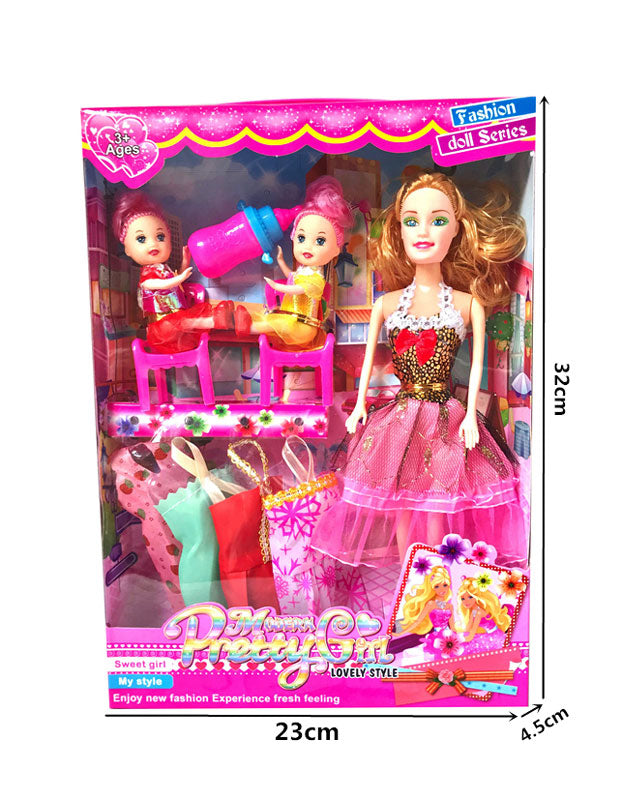 LoginCheap bulk wholesale of 10PC fashion doll with twins babies and dresses toy set. These non battery operated plastic girls fashion play toys are cutely designed and great for little girls to play dress up. Large attractive window box display make these great gifts! This set of princess doll closet includes 1 mommy doll, twin babies, 2 chairs, 1 baby bottle and 4 set of extra dresses.