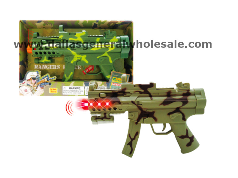 LoginToy Machine Ranger Force Guns Wholesale in bulk quantities are available for children. These battery-operated guns feature lights, sounds, and vibrations when the trigger is pulled. The product comes equipped with detachable shoulder straps and has a realistic battery-operated rifle gun look. It emits realistic fire sounds and flashing lights, and the barrel extends in and out every time the trigger is depressed. Requires 3 AA batteries (included).