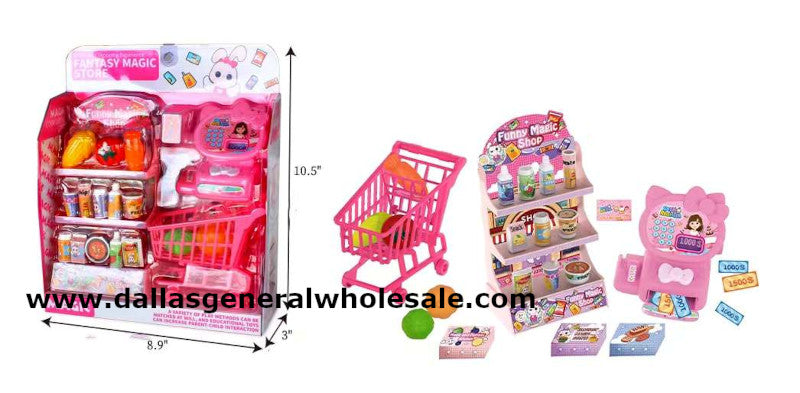 LoginIn bulk quantities, non-battery operated plastic pretend play grocery shop play set is offered at wholesale prices. Cutely designed, these play toys are great for early childhood education and can provide hours of fun for play-house activities. The varied selection of dessert and dinner food toy set makes these ideal for adding to your toy inventory. Includes a large cardboard display.
