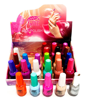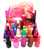 Login24 colors of assorted 22 ml nail polish in a display box. Gorgeous colors, including many bright neon colors. Minimum purchase is 24 pieces, display box included.