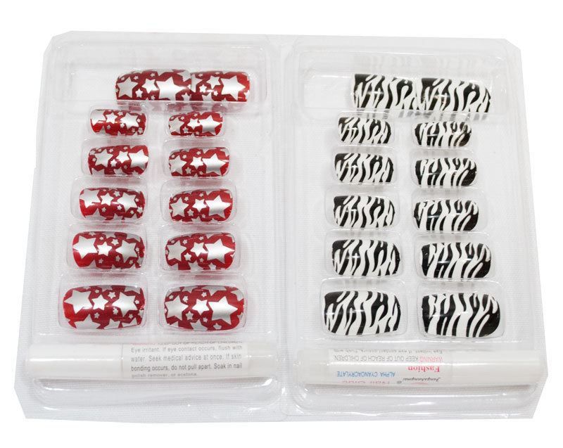 LoginThis Nail Art Set includes 12 Pieces of Fake Nails and a glue. These False Nails are pre-designed with pretty air brushed animal prints or stars. 3D designs include pearls and rhinestones are also included. 12 different fun and pretty designs assorted. Designs may vary.