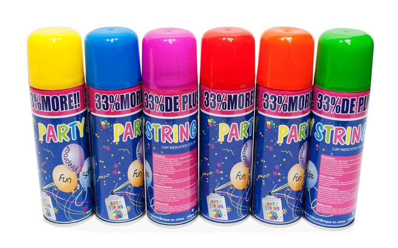 LoginCheap bulk wholesale of party crazy silly string sprays. These crazy string spray bottles are available in 6 different colors, each can contains a mixtures of colors of crazy strings. These crazy strings are non-flammable, super quick to dry, and very easy to clean up. These silly strings are non sticky. A purchase of 24 pieces come with a display box.