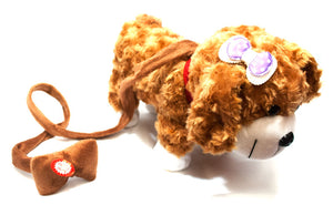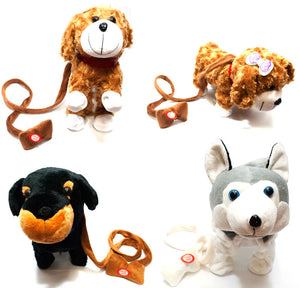 Cheap bulk wholesale of battery operated toy fluffy puppy dog with a leash that walks and barks. These toy plush dogs are adorable with different designs. This dog walks and barks at the control of the owner. On/Off button at the end of the leash; once the button is pressed, this cute fluffy toy dog starts to walk and bark so realistically. Great toy to carry in your store.