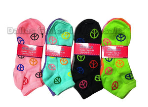 LoginBulk wholesale of women's printed casual funky ankle socks. These cute designed ankle casual socks are great for women, or teen girls. These women's casual socks are perfect for everyday wear or sports wear. These ladies cotton socks are designed with elastic cuffs and colorful peace sign prints.